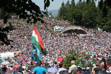 A szélrózsa minden irányából érkeztek zarándokok egyénileg és közösségileg szombaton a 450. csíksomlyói búcsúra, hogy benépesítsék a Kis- és Nagysomlyó-hegy közti nyerget, megerősödjenek hitükben és az összetartozás örömében. Az idei pünkösdi ünnepi szentmise jelmondata – „Tarts meg minket őseink szent hitében” – a székelyek által régebb megfogalmazott fohász, amely a Salvator-kápolna előtti kereszten olvasható.