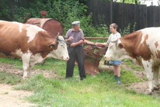 Jelképesen esett szó az asztalról id. Ambarus Gábornál, aki kora ellenére (1934-ben született) mezőt művel, ökröket tart, s a Háromszéki Magyarok Világtalálkozójának ünnepi felvonulásán a közeli Óriáspince-tető alatt, melyet a besenyőiek Benke-hegy néven emlegetnek, az ő pár szép ökre volt az ,,igazi, eredeti látnivaló". ,,Ha állatot tartasz, adj enni neki" — ismételgeti a régi igazságot Gábor bátyánk. Szépek is a hétéves ökrök: egyiket Vidámnak, a másikat Gyurinak hívják. Gyuri a szebb, s bár ikrek, Gábor bácsi unokájának, Alpárnak mégis utóbbi a kedvence.