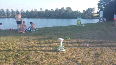 A gálába öltözött mulatók mögött többnyire gyermekes családok strandolnak. A víz kellemes hőmérsékletű, minőségéről persze semmit nem tudni, de az ide járók nem is firtatják. Mindenfelé kifüggesztett feliratok tudatják, hogy fürdeni csak saját felelősségre szabad, és azt is, hogy horgászni tilos – a szemközti partszakaszon azonban majdnem mindig ül valaki bottal a kezében. A sátorozás megengedett, de inkább hétvégi szórakozás, munkanapokon kevesen laknak az amúgy hangulatos, de gondozatlan partszakaszon, a fák alatt. Belépti díj hétköznap nincs, pedig hátul szabadtéri zuhanyozó és elfogadható állapotú, vízöblítéses illemhely is található, no meg egy múlt századból itt felejtett játszótér. A még ép vasszerkezeteket úgy-ahogy karbantartják, némelyiket újra is festették, de mindegyik élesen nyikorog. A dróthálóval bekerített sportpálya mögött egy rozsdamarta, régi csúszda várja az enyészetet, hátrább egy hajdani kerítés beton tartóoszlopai árválkodnak. Kóbor kutya bóklászik közöttük, ételmaradékok után kutat.