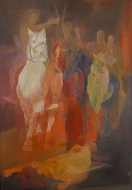 A transzcendencia titkát két másik örök titok fokozza: a végtelen, folyton ismétlődő, féktelen forgásba, olykor örvénybe vonzó kör és a nő. A Goethe költészetéből ismert villitáncot, vészes csábítást idézi számomra a Patak, a Tükör. A derűt, meleget sugárzó fény valamennyi képen jelen van. Megemlíteném még a kecses lovakat ábrázoló vagy a római hangulatokat idéző, mediterrán színekben pompázó képeket.
