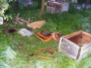 Hat keret teljesen tönkrement, a kaptárak tetejét megrongálta (képünk) — közölte Deák Ferenc, akinek a kertje, érdekes módon, nem a hegylábra, az erdő felé nyílik, hanem az Olt árterületére lejt.