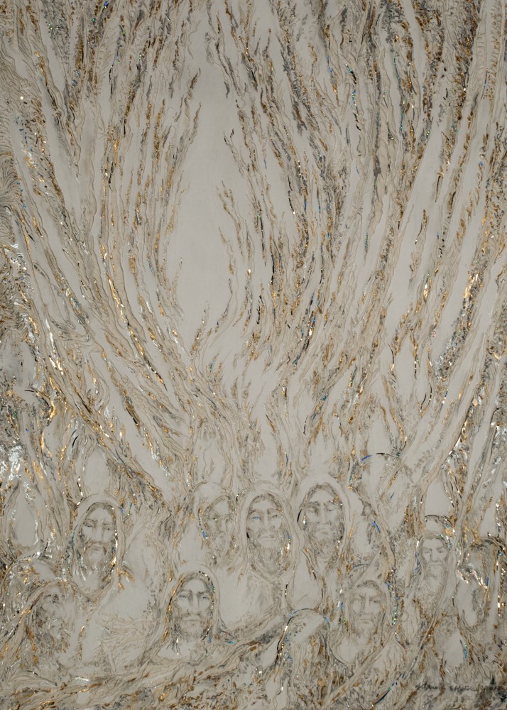 Kosztándi B. Katalin Felismerés című képével zárom a szubjektív tárlatvezetést. A márciusi tárlatok négy alkalommal mutatták fel itt élő alkotó vallásos témákat feldolgozó képeit. Az akvarellalapon fémes hatást keltő ragasztásokkal teremt plasztikus szilárdságot. A Szentlélek eljövetele a tanítványok halandó léte felé emelkedő áramlatban és a felmutatott tiszta centrumban a beteljesedett igét váltja képpé. A részletgazdag kidolgozottság az alkotó alázatos meditációját közvetíti.