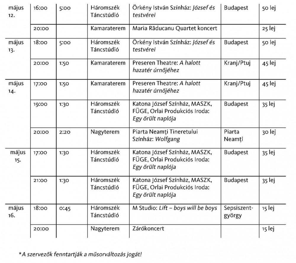 Az idei fesztivál egyik fő célkitűzése, hogy a minőségi műsorkínálat szélesebb közönségréteghez jusson el. Ennek megfelelően egy előadást akár több alkalommal is lejátszanak. Ennek ellenére érdemes időben jegyet váltani, hiszen ezek csak személyesen vagy online vásárolhatóak meg.