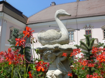 A kúria előtti kis parkban egy gyűrűvel övezett virágágyás közepén fehér szobor áll: egy puttó által fenntartott tálszerű talapzaton átnyilazott nyakú hattyú. Csak egyetlen hattyú! Az átlagember nem tudja mire vélni, a „tájékozottabbak” az iktári Bethlen család címerállatának vélik. Az igazán tájékozottak tudják, nem arról van szó! A virágágyás utólag feltöltött medence, korábban szökőkútként díszelgett, és társa is volt: azt viszont oroszlán szobra ékítette. Az meg eltűnt. Ám rondítja a tájat az előtérbe felállított három mellszobor. Horea, Cloșca és Crișan, az 1784-es véres, a magyarokat érintő igen gyászos lázadás vezérei, Ion Vlasiu 1934-es alkotásai, amelyeket 1962-ben költöztettek oda.