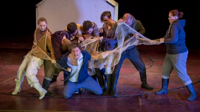 Az alkotók kidolgoztak egy módszert, aminek segítségével jól működik az adaptáció: a színészek nemcsak párbeszédeket folytatnak, hanem narrálják is magukat, így téve egészen egyértelművé a közönség számára azt a rengeteg eseményt, amit a színpadon láthatunk. Az előadás egyik legfőbb jellemzője a játékosság, mindaz, amit elmesél, nem életszerűen történik meg a szemünk előtt, hanem többnyire csak jelzésekben, néhány egyszerű kellék és egy tucat életnagyságú állatszobor segítségével, amelyek a lehető legtermészetesebb módon kerülnek játékba, és bármennyire is abszurdnak tűnnek egyes jelenetekben, nagyon sokat segítenek a térrendezésben, a helyzetek, viszonyok kialakításában. Forgószínpadon, majdnem üres térben zajlik a játék, ahol pillanatok alatt megtörténhettek a helyszínváltozások; a színészek viszonylag gyors ritmusban pörgetik a szöveget és azzal együtt a cselekményt is, ami adott esetben azzal jár, hogy a szereplők közötti kapcsolatok nem tudnak arra a szintre mélyülni, ahol valóban megrendítővé válhatott volna az előadás.