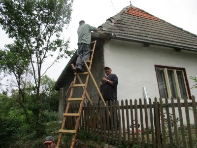 Ellátogattunk Szacsvára is. A református műemlék templom előtt itt is ajándék székely zászlót lobogtatott a szél. Ez azonban csak az egyik biztató helyi jel, ugyanis a száz lelket alig meghaladó gyülekezet anyagi lehetőségei korlátozottak. Gáll Zsigmond gondnokkal a felújított papi lakásnál találkoztunk. Barabás Dénes önkéntessel és unokájával esőcsatornát szereltek, hogy védjék az épületet a tetőről alácsepegő víztől (képünk).