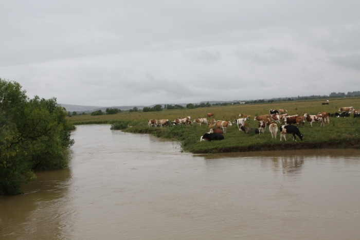 Nem öntötte el a védőgátak közötti árterületet sem – mint ahogyan az történt a tavaszi áradáskor –, a legelőn békésen legelésztek a tehenek. Nagyborosnyónál a Kovászna patakának magasságát vettük szemügyre, de a vízszint még mesze volt a gát tetejétől, habár látszott, a hirtelen áradásokról híres vízfolyás még tartogathat meglepetéseket.