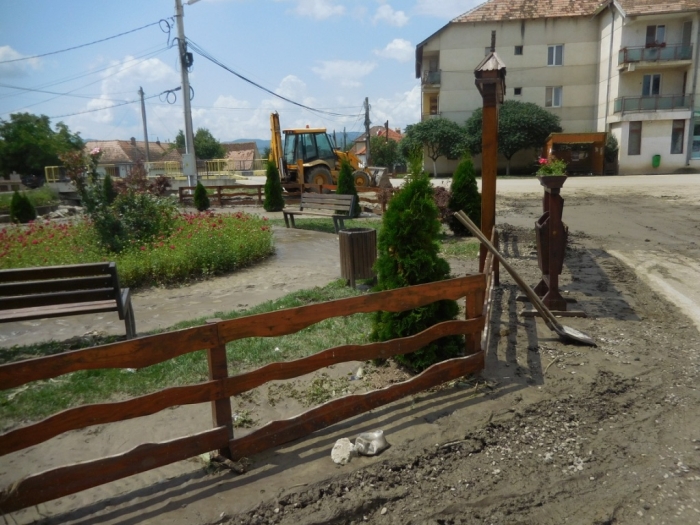 A faluközpont kicsiny parkocskája is megtelt iszappal