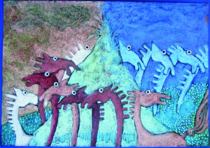 Mellettük, benn a képtérben, mint azok elemei: emberfigurák, meseállatok – tyúkok, kakas, madarak, kutyák, lovak, szarvas, hal vagy azonosíthatatlan négylábú lények, néha sorokba rendezve, a mozgásukkal, menetelésükkel is kifejezve. Szárnyal a művészi fantázia, itt-ott figuráktól elszakított, néha álarcszerűvé formált fejek – állatfejek is –, kezek, széken vagy székkarfán gyermekrajzszerűen megjelenített, ugrándozó mesefigurák vagy önálló életre keltett, már-már képelemi minőséget kapott kakasszárny, kakasfarok, meghatározhatatlan foltok, foltokon foltok, esetleg mögülük itt-ott elősejlő vakolt vagy vakolatlan házfalrészek, téglasorok, léckerítésdarabok, mintha barlangbejárat, minden átköltve, inkább szimbólumokká alakítva, önmaguk jelképeivé. Meseelemmé, egy költött világ részeivé.