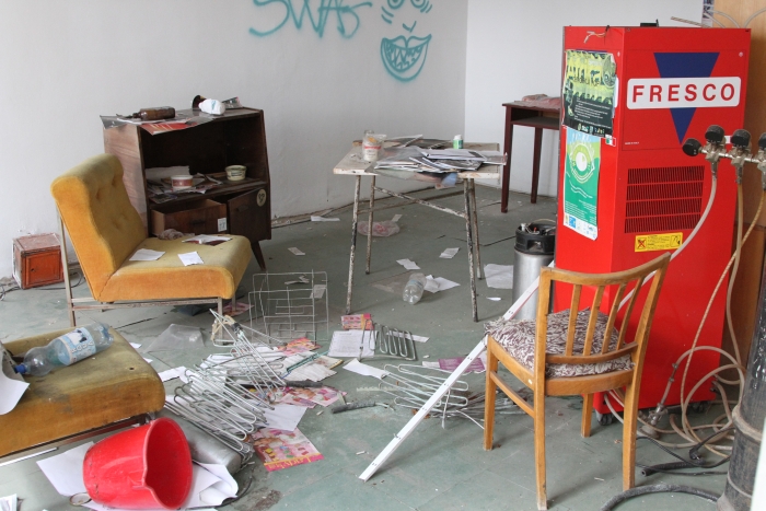 Az épület többi részén viszont szinte nem találni olyan sarkot, ahol ne az enyészet vagy a rombolás nyomai látszanának. Az előtérben nagy kupac szemét fogad – az ürüléket már eltávolították, a folyósokon hasonló a helyzet –, ezt időközben nagyrészt felszámolták már a diákok, a hulladék szétválogatásával ezen a héten végeztek. A belső udvaron egy vastraverzen Coca Cola fényreklám hirdeti, nem is oly régen itt még szórakozóhely is működött, amelynek egykori felszereléséből ottjártunkkor még sok látható volt a nagytermek egyikében (italosládák, ülőalkalmatosságok, díszítőelemek a falakon, meg a fogadópult). Időközben a tárgyak jó részét az önkéntes diákok a belső udvaron helyezték el. Ezt csendesen a természet is visszahódítja, fa és bokor, gyom nő háborítatlanul a sok helyütt széttöredezett burkolat között, illetve az egykori kismedencében.