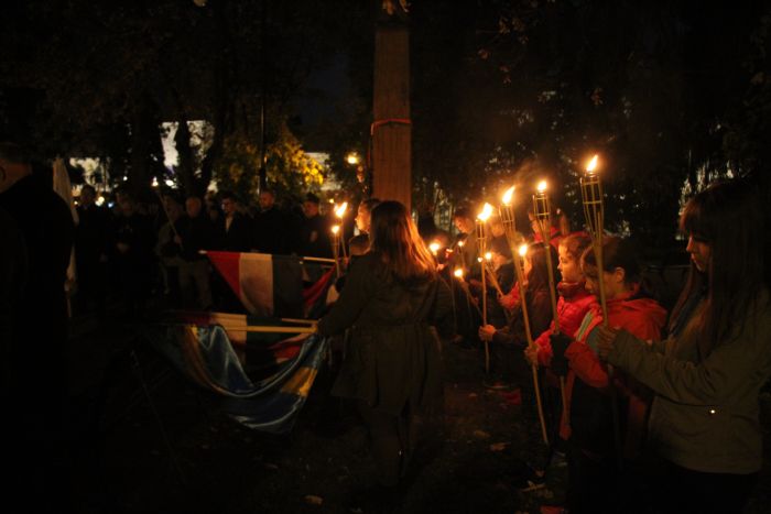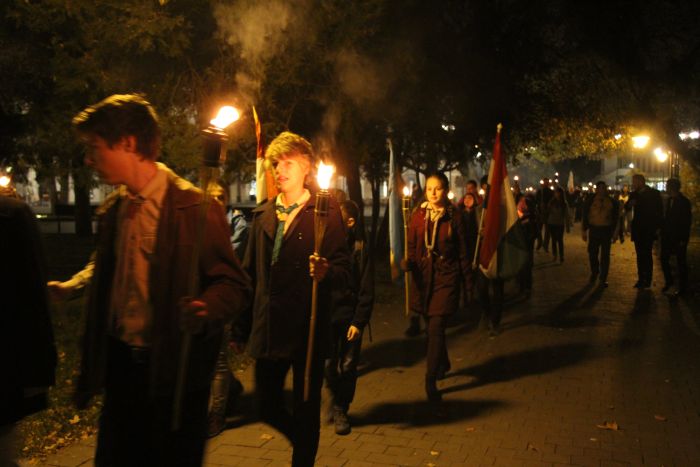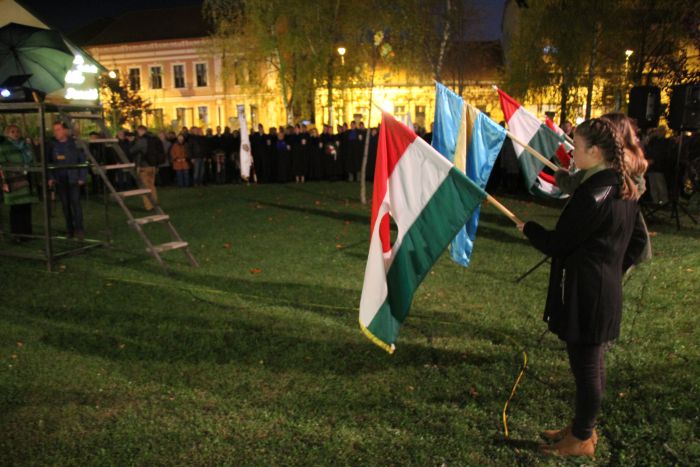 Az október 23-i ünnepségek hagyományához híven a közönség a cserkészek vezetésével fáklyás menetben vonult át az Erzsébet parkba, ahol a kommunizmus áldozatainak emlékére állított monumentális kopjafánál a Cantus Firmus Vegyes Kar előadását követően főtisztelendő Dávid György plébános mondott áldást, majd itt is koszorúzással zárult a rendezvény.