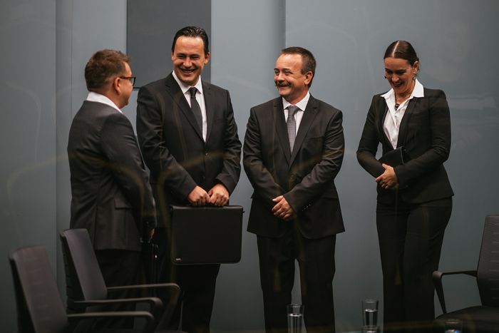 Egyszerű, de látványos díszlet, jelmezek. Látható és láthatatlan falak között egy asztal, négy szék, négy pohár víz és négy öltönyös menedzserjelölt. Emberek, akik mindenre készek, hogy elnyerjék a jól fizető munkahelyet. Egy olyan színház előadása, ahol folyamatosan összevonnak állásokat, mert lassan lehetetlen olyan embereket találni, akik ennyi pénzért elvégeznék ezeket a feladatokat. A bemutató végén egy fejfájás elleni gyógyszert kért a hangosító, aki közönségszervező, művészeti titkár és rendező is egyben. Elismeréssel nyújtottam át neki.