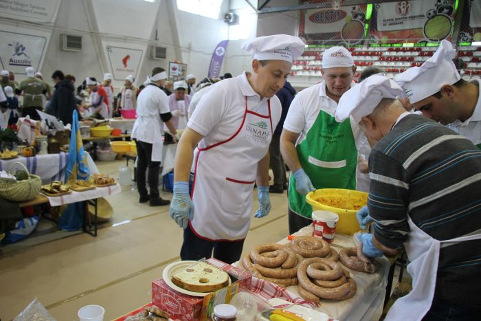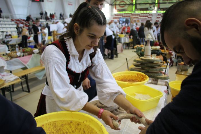 Eközben a sportcsarnokban kialakított „küzdőtéren” a gasztrofesztiválra bejelentkezett csapatok mindegyike sajátos öltözetben vagy gyönyörű népviseletben, tetszetős és ötletes díszítéssel, finom falatokkal ékesített asztalokon vágott neki a versenynek. A hatóságok figyelmeztetését mindannyian komolyan vették, otthonról vitt húst, húskészítményt sehol sem találtak – mondta érdeklődésünkre még zsűrizés előtt Sikó-Barabási Sándor megyei főállatorvos, akinek kollégái biztonságból verseny közben is szemlézték a csapatokat.