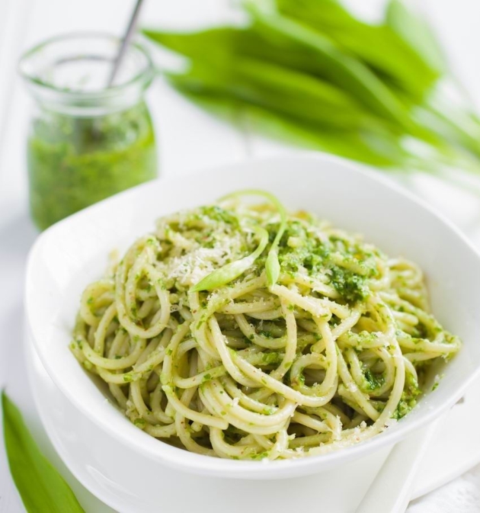 Hozzávalók: csokornyi medvehagyma, hasonló mennyiségű petrezselyemzöld, 50 g parmezán sajt, 50 g fenyőmag – ez hasonló mennyiségű napraforgómaggal, esetleg mandulával is helyettesíthető –, 100–120 ml olívaolaj. Mossuk meg a zöld leveleket, vágjuk nagyobb darabokra, reszeljük le a parmezánt, majd a többi hozzávalóval együtt pürésítsük, ízesítsük frissen darált borssal, sóval. Szűrjük le a kifőtt tésztát, a főzőléből azonban tartsunk meg egy bögrényit. Kavarjuk össze a pestóval, s ha kissé kevésnek találnánk a mártást, bátran öntsünk hozzá a főzőléből – sokat javít az étel állagán, ízén is. A tésztakedvelő olaszok gyakran használják ezt a fortélyt.