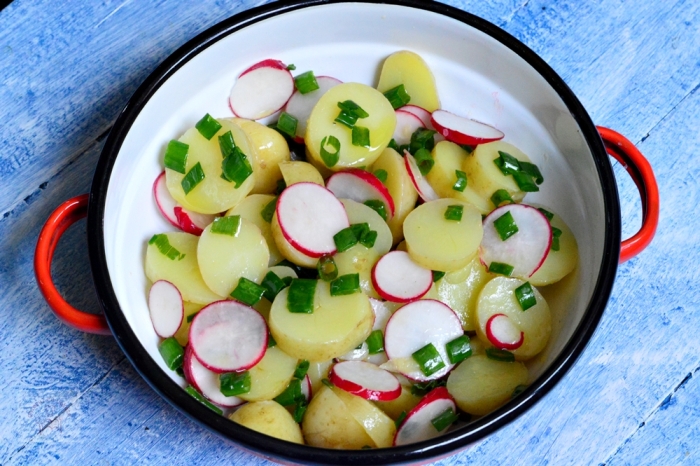 Főzzünk meg 40 dkg krumplit héjában, tisztítsuk meg és még langyosan karikázzuk fel. Egy nagyobb tálba téve adjunk hozzá egy nagy csokor felaprózott zöldhagymát, egy csokor vékonyra szeletelt retket, illetve némi aprított petrezselyemzöldet. Sózzuk és borsozzuk ízlés szerint, majd lazán kavarjuk össze a hozzávalókat kevés napraforgó- vagy olívaolajjal.