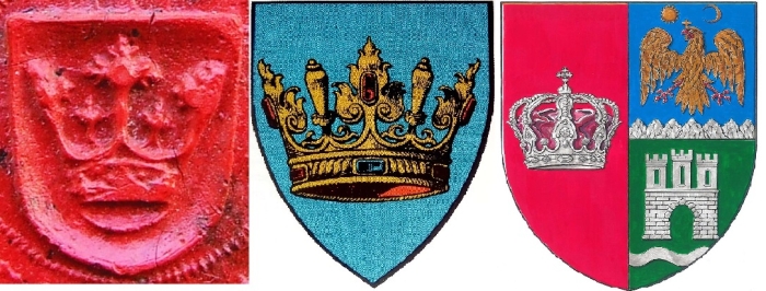 Hátulról kezdjük a boncolgatást. Kőhalom vagy Kőhalomszék címere nem ilyen, hanem kék mezőben három magas ezüst bástya, fölöttük egy-egy arany korona. A mindhárom térséget átszelő folyót egyáltalán nem indokolt bezsúfolni a címerbe, Kőhalomszék állítólagos címerében sincs helye. Fogarasföld címere sosem nézett így ki. A korábbi Fogaras vármegye címerében egy csónakban álló magyar huszár és ülő török látható, ám Fogaras város régi címerében két hal szerepel. És mint említettem, Brassó vidék címere egyszerű nyílt korona.