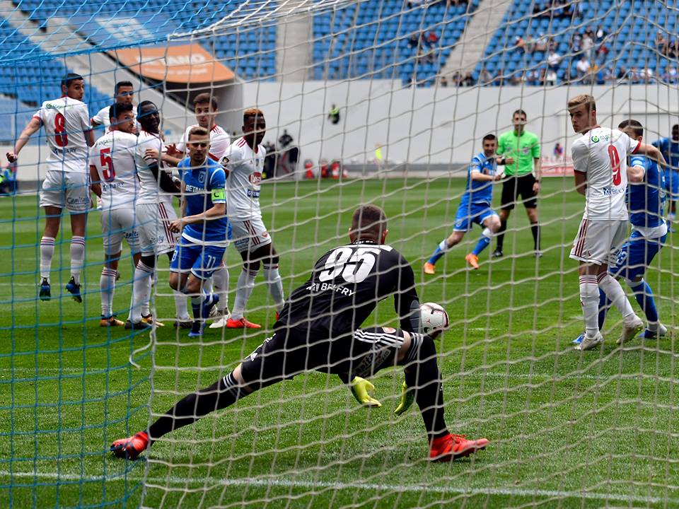 A playoffban elképzeléstelen támadójátékkal és motiválatlanul pályára lépő szentgyörgyi csapat az európai kupaszereplésre hajtó Craiova elleni első félidőben egyértelműen az alárendelt szerepét töltötte be, nem meglepő módon ezúttal is teljes mértékben a védekezésre koncentráltak. A házigazdák beszorították a piros-fehéreket, beadásokkal próbáltak veszélyt teremteni, így Fejér Béla kapusnak többször is védenie kellett. Craiova már a mérkőzés elején megszerezhette volna a vezetést, azonban a teljesen egyedül hagyott Alexandru Cicâldău fejese a jobb kapufáról pattant vissza, majd Fejér egy támadással később Andrei Cristea szabadrúgását magabiztosan fogta.