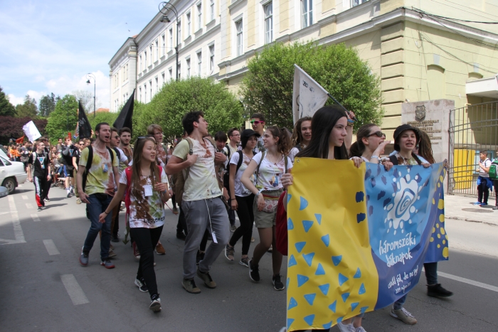 Az elöljáró szavait üdvrivalgás fogadta, majd egy látványos villámcsődületre került sor: egymás kezét megfogva hosszú láncot alakítottak ki, aztán spirál alakban körbeszaladva egy óriási napocskát formáltak a téren, mely valójában a Háromszéki Diáknapok logóját ábrázolta. Ezután sorban elindultak a Berde Áron Szakközépiskola sportterme felé. A hangulat olyan volt, mintha egy hatalmas energiabomba robbant volna a főtéren.