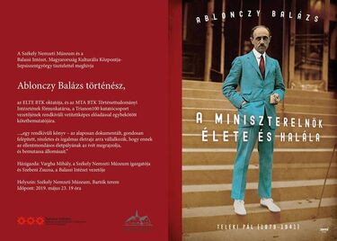 ABLONCZY BALÁZS történész, az ELTE BTK oktatója, és az MTA BTK Történettudományi Intézetének főmunkatársa, a Trianon100 kutatócsoport vezetője rendkívüli vetített képes előadással egybekötött könyvbemutató tart A miniszterelnök élete és halála – Teleki Pál (1879–1941) címmel ma 19 órától Sepsiszentgyörgyön, a Székely Nemzeti Múzeum Bartók Termében. Házigazda: Vargha Mihály, a Székely Nemzeti Múzeum igazgatója és Szebeni Zsuzsa, a Balassi Intézet vezetője.