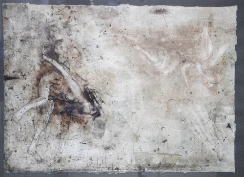 A kép felső határát keresztfaként fenntartó krisztusi sors a legszemélyesebb vallomás a nekifeszülő helytállás megpróbáltatásáról (Végtelenben). Faunja a szemlélődő ember bölcs derűjével írja felül a mítosz konvencióját. Diófapác vonalainak bensőséges lágy fuvallatai az idő határait tágítják, régmúlt történések válnak újra korszerűvé. A merített papír bolyhos felületén a maga vájatát mélyítő pác a rétegek árnyalatának meditatív gazdagságába vezet.