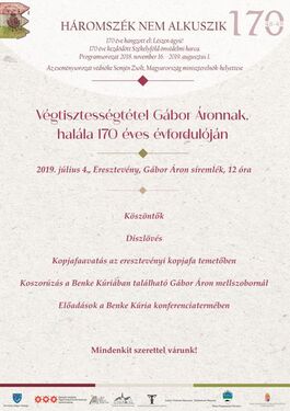 Eresztevényben július 4-én, csütörtökön 12 órától a síremléknél halálának 170. évfordulóján végtisztességet adnak Gábor Áronnak. A köszöntők és a díszlövés után kopjafaavatásra kerül sor. A Benke-kúriában található Gábor Áron-mellszobor koszorúzása után a kúria konferenciatermében előadásokkal folytatódik a Háromszék nem alkuszik rendezvénysorozatba tartozó esemény.