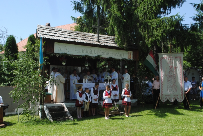 A szabadtéri oltárnál házigazdaként Tifán Lajos plébános köszöntötte a vendégeket, Tamás József püspököt, Szabó Lajos kanonokot, a környékbeli papságot, a csíkmadéfalviakat, a világi méltóságokat és a határon inneni és túli zarándokokat. A szentbeszédet Szabó Lajos kanonok, a sepsiszentgyörgyi belvárosi Szent József-templom aranymisés plébánosa tartotta, aki arról beszélt, mekkora kegyelem volt az, hogy egy hónappal ezelőtt Ferenc pápa Csíksomlyóra látogatott. „A mai ember boldogságkeresésében három mozzanatot, utat jelölnék meg: az egyik a hit, a másik a karrier, a harmadik a hatalom, amivel lezáródik az igazi út, ami a boldogság felé vezet, csökken és elmarad az Istenhit, és beköltözik a lelkünkbe az új pogányság” – hívta fel a figyelmet korunk jelenségére a kanonok, arra biztatva híveit, hogy térjenek vissza az ősi hithez, amit tovább kell adni az utódoknak.