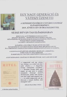 A sepsiszentgyörgyi unitárius egyház előadótermében ma 18 órától Szász István Tas A nagy generáció és váteszi üzenetei címmel bemutatja a kolozsvári Hitel nemzetpolitikai szemle (1935–1944) születésének, működésének és elhallgatásának történetét, mának szóló üzeneteit, budapesti újjászületését.