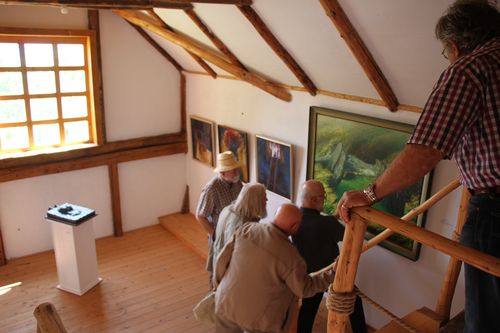 Ahogy a csűr kapuján belépsz, hat hegedűs fogad, Székely Levente hegedűművész és tanítványai hangolnak az ünnepségre Köllő Margit Fészek című kétméteres textilmunkája és Gyimesi katedrális című nyomata alatt, oldalból, az ablak irányából Bocskay Vince Kitekintés című bronzszobra áll, a kitekintők előtt lehúzott függöny.