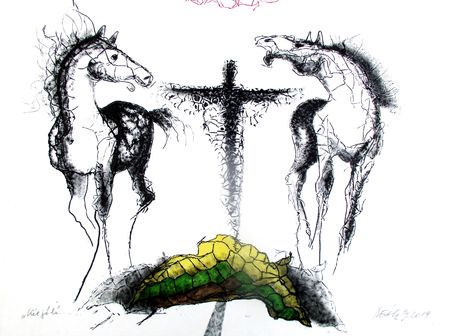 Az ún. közös Művet egy falon állították ki a művészek, és tizenhét részletből áll. Közös a mű, mert az alkotások ihletforrása Kányádi Sándor A jó két ló szolgája c. verse, és az alkotók azonos méretű farostlemezre vitték rá a költemény keltette érzéseiket, gondolataikat. Kányádi életművének egyik visszatérő motívuma a lovait kereső, lovait elveszítő gyermek. A motívum mögött gyermekkori megélt tapasztalat áll: kedvenc lovát farkasok tépték szét. A tizenhét alkotáson, amely a közös Művet alkotja, a költemény fő motívumaival találkozunk: a gyermekkel, aki kezdetben kényszerű szolgája a lovaknak, a lovakkal, amelyek aztán egy megváltozott viszonyban a gyermek társaivá lesznek-alakulnak, mígnem szoros összetartozásuknak a lovak halála vet véget. A vers legszebb képe a zárlatban található: „Csillag-zabot esznek,/ hold szalmáján hálnak,/ csengős táncot már csak/ álmaimban járnak.”, nem véletlen, hogy legtöbb alkotást ez a látomás ihlette meg.