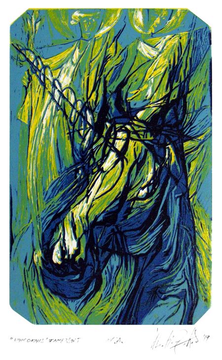 A négyfalusi Tomos Tünde és a székelyudvarhelyi Kovács Ildikó meleg színei az egymáshoz tartozás, a társ mivolt szépségét emelik ki az irodalmi alkotásokból. A brassói Dimény András Lófürösztés c. grafikája pedig azokra a lovakra – emberekre – hívja fel a figyelmet, amelyek-akik nincsenek a figyelem középpontjában, de célirányosan, egy irányba mozdulva vállalják a cselekvést. A szintén brassói Ábrahám Jakab színes fametszetének unikornisa, valamint a vonalak és a szín expresszív erejével megteremtett, befogadóval szembenéző kék lovai – Franz Marc kék lovait is megidézve – a testi erőt és a szellem teremtő munkáját érzékeltetik.