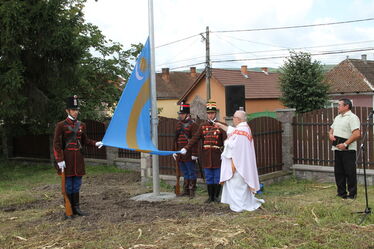 Simó Gábor plébános áldását követően a Nagykürt 1995 Fúvósegyesület közreműködésével az egybegyűltek elénekelték himnuszainkat, majd az Erdély induló dallamaira a huszárok vonták fel a székely zászlót.