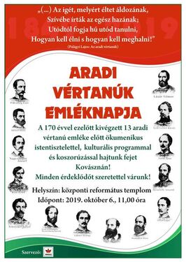 Október 6-án lesz 170 éve annak, hogy Aradon kivégezték a magyar szabadságharc 13 honvéd tábornokát. A megemlékezések programja Háromszéken: