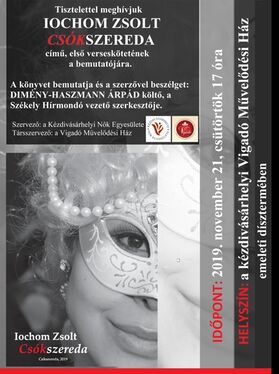 KÉZDIVÁSÁRHELY. A Vigadó Művelődési Ház emeleti dísztermében csütörtökön 17 órától a kézdivásárhelyi születésű, jelenleg Csíkszeredában élő Iochom Zsolt Csókszereda című első verseskötetét bemutatja és a szerzővel beszélget Dimény-Haszmann Árpád költő, a Székely Hírmondó vezető szerkesztője.