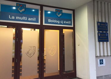 A Kovászna Megye Tanácsa hivatalos névtábla továbbra is ott áll a bejárat jobb oldalán a hatályos előírásoknak megfelelő méretben és sorrendben. Az épület homlokzatáról már régebb eltűnt a tájékoztató felirat, a bejárati ajtón ott virít: La mulți ani! és Boldog új évet. Igaz, nem egymás alatt, hanem egymás mellett.