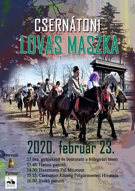 CSERNÁTON. Vasárnap 13 órakor gyülekező és a lovas maszkák bemutatója a fellegvári téren, 13.45-től a Hanna Panziónál, 14.30-tól a Haszmann Pál Múzeumnál, 15.15-től Csernáton Község Polgármesteri Hivatalánál, 16 órától az Enikő Panziónál.