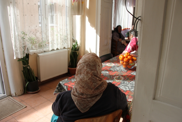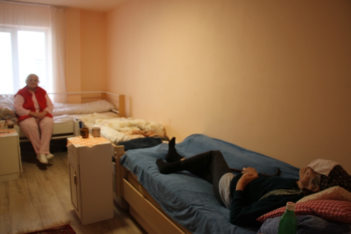 Az előbbiekkel ellentétes világ fogad a felújítatlan régi épületben. Belépéskor még nem tűnik fel, hogy a verandaszerű előtér, ahol békésen beszélgetnek a jobb egészségi állapotban lévők, tulajdonképpen mi mindenre szolgál. Itt ebédelnek, akik fel tudnak kelni, itt járnak át a szobákból a lakók a folyosó végében lévő mosdókba, s bár vannak mobilvécék, a legtöbben nem sok hasznát veszik, hiába teszik az ágyuk mellé, nem tudnak felkelni. A külső szemlélőnek a zsúfoltság már-már elviselhetetlen, nem csoda, hogy a megyei szociális kifizetési és ellenőrzési ügynökség rövid határidőt szabott a helyzet orvoslására. Egy nyolcágyas, két ötágyas, egy háromágyas és két kétágyas szobában vannak elhelyezve a lakók, egy férfi egy akkorka kuckóban fekszik – állítólag saját kérésére –, ahol az ágyon kívül nem is fér el egyéb. Számunkra elképzelhetetlen, hogy ilyen körülmények között jól érezze magát valaki, de az idősek, a beszédesebbek elmondták, ők jól vannak.