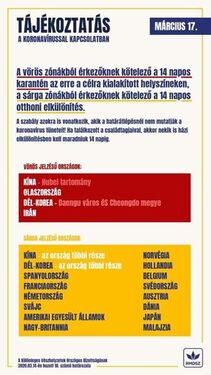 Vörös jelzésű országok jelenleg (kötelező karantén): Kína – Hubei tartomány; Olaszország; Dél-Korea – Daengu város és Cheongdo megye; Irán.
