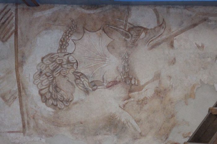 Székelydálya, református templom, Szent György harca a sárkánnyal – falképrészlet. Fotó: Mudrák Attila