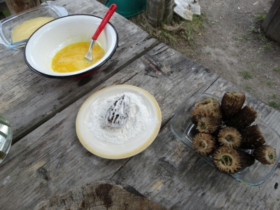 A saját tönkjükkel megtöltött kalapok kukoricalisztbe panírozva kerültek a forró olajba