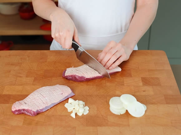 Közepes fej hagymát apróra vágunk, zsíron dinsztelni tesszük. Ne sajnáljuk az időt, nem párolt, hanem dinsztelt hagymára van szükségünk. Apróbb darabokra vágjuk a sertéshúst. Legyen vegyes, zsírosabb falatokkal is, ha túl száraz a hús, rontja az evés élvezetét. A dinsztelt hagymához adjuk. Az elején ne öntsük fel vízzel, várjuk meg, míg a hús kiengedi a levét. Ne sózzuk túlságosan, a leves sósságát a káposztalé adja majd.