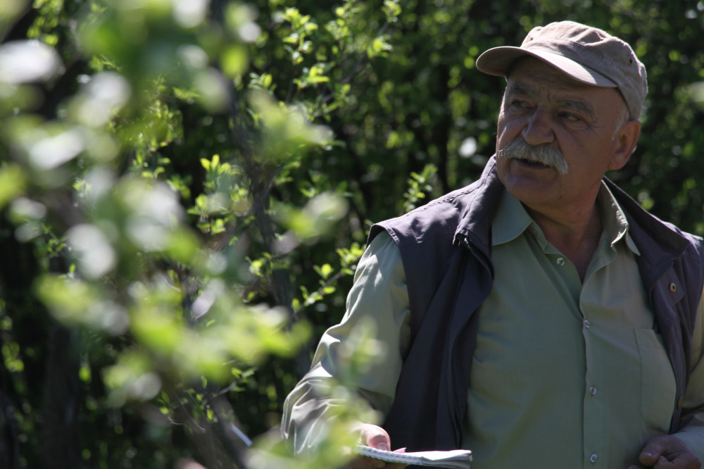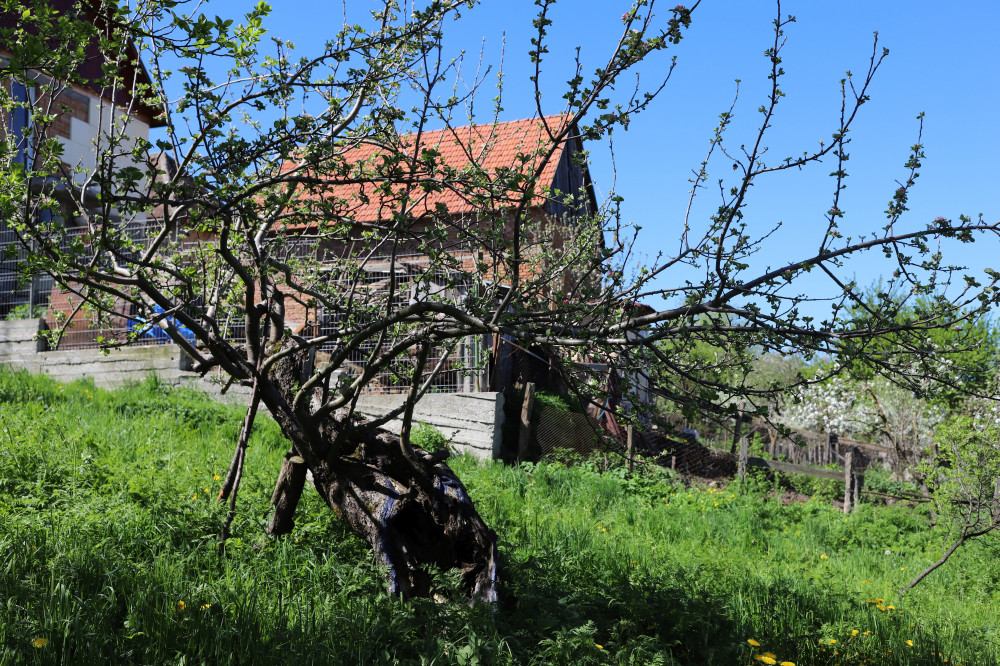 – Ez itt a zöld batul – indítottuk a bemutatót –, már virágzik is. Van ennek több változata: fehér batul, mosolygós batul, s egy piros is. Mellette a nyári alma, amely az egerpataki Módi-Kóréh Sándor kertjéből való. Ez itt a Török Bálint, nem tudom, hogy honnan van a neve, Szászföldön gyűjtöttem, ahol elég sok van belőle és Stettinel a neve, amiből arra lehet következtetni, hogy az egykori Poroszországból származik, amely most Lengyelország része. Ezt az aranypárment Szászrégenből hoztam, ahol már nagyon kiment divatból, alig lehet kapni, nálunk bővebben van, nagyon értékes alma. Ez a nemes sóvári, Zalánpatakon gyűjtöttem Karácsony Ferenc kertjéből. Van itt egy nagyon korai Fehér Klára alma, nálunk árpával érőként ismerik.