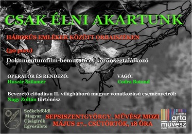 Huszár Szilamér Csak élni akartunk – Háborús emlékek között Orbaiszéken című 30 perces dokumentumfilmjét mutatják be a sepsiszentgyörgyi Művész moziban csütörtökön 18 órai kezdettel.