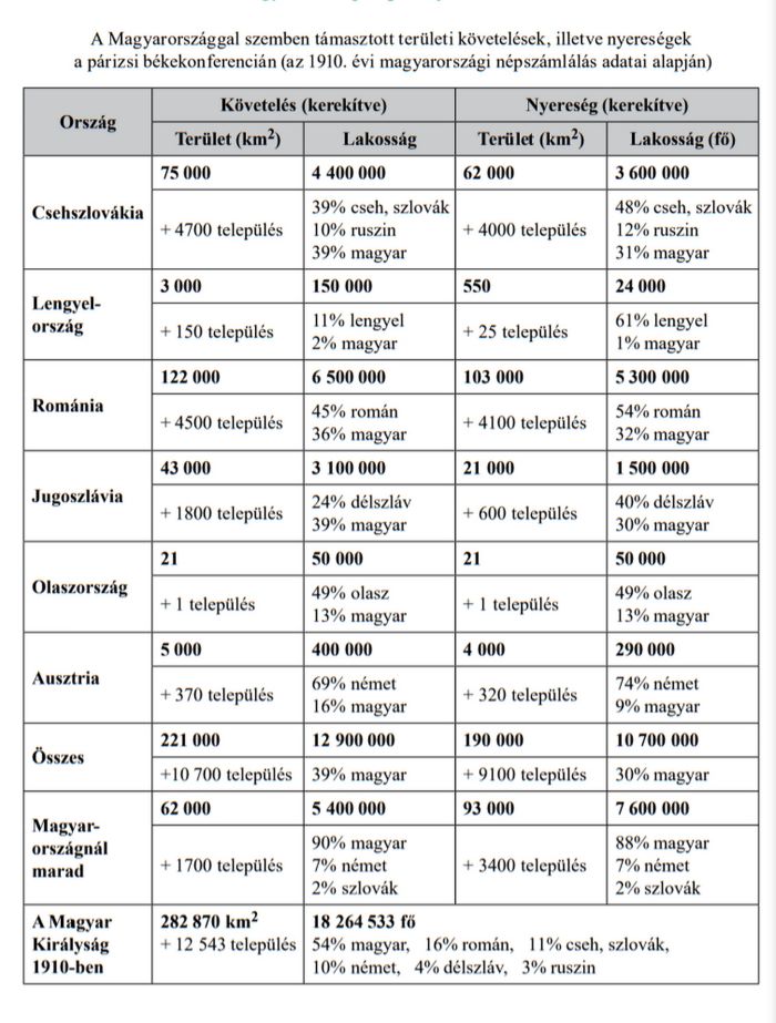Ha a nagyhatalmak valamennyi fenti követelésnek helyt adtak volna, a Magyar Királyság területének 78 százalékát, népességének pedig 70 százalékát veszíti el, s az új állam 62 ezer km2-re zsugorodik, mindössze 5,4 milliós népességgel. Ha viszont a békekonferencia tisztán az etnikai elvet érvényesíti – és nem vonja kétségbe a magyarországi népszámlálások nemzetiségi adatainak hitelességét –, akkor az új Magyarország területe mintegy 120 ezer km2, lakossága mintegy 10 millió fő lehetett volna. A békeszerzők döntéséből végül egyfajta „kompromisszum” volt kiolvasható: az új határok egy 93 ezer km2-es, az 1910. évi cenzus szerint 7,6 millió lakost számláló Magyarország képét rajzolták ki.