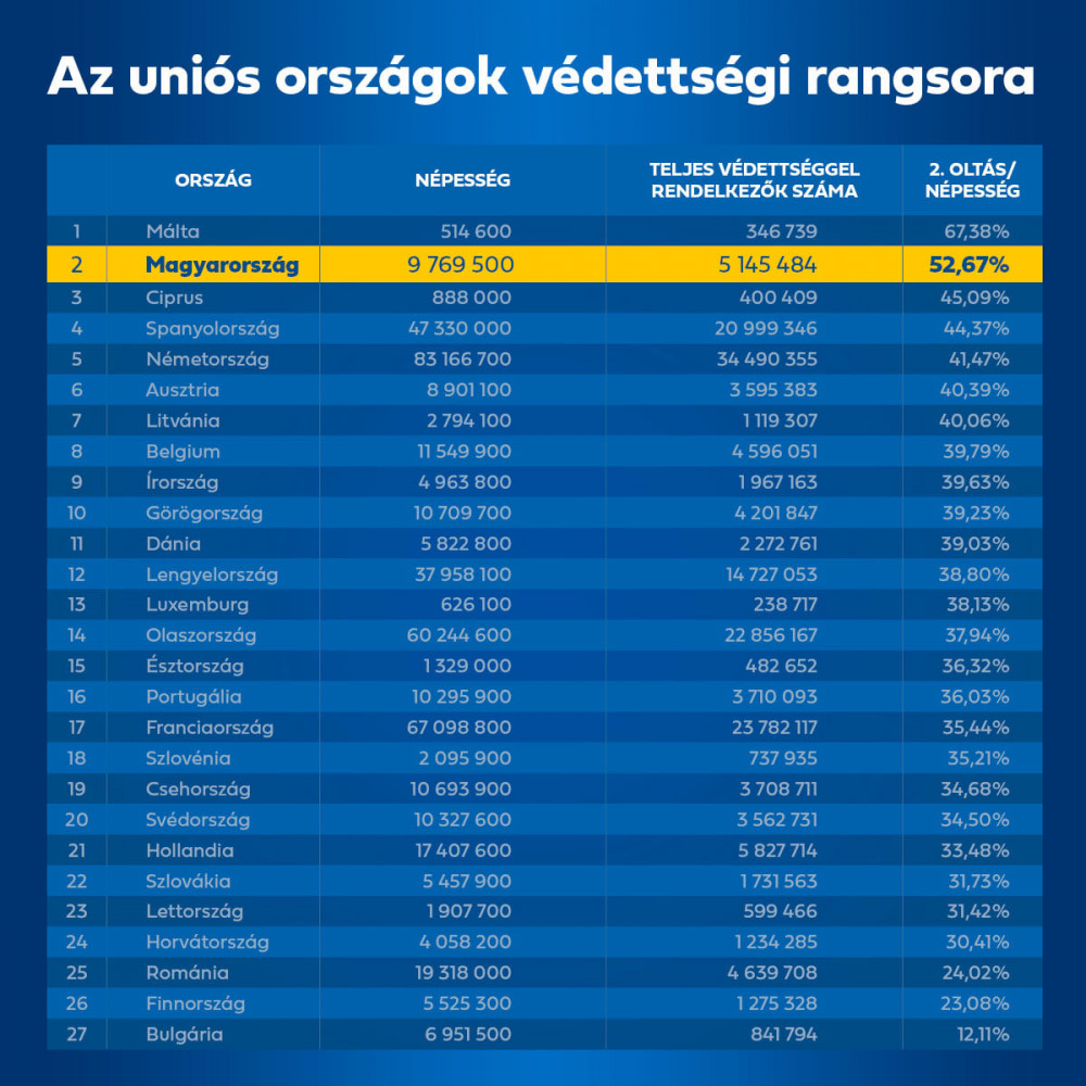 Magyarországot továbbra is csak Málta előzi meg a lakosság átoltottságát tekintve. Magyarországon 5 145 484 fő már teljes védettséggel rendelkezik, vagyis a 9,7 milliós lakosság 52,67 százaléka felvette a második koronavírus elleni vakcinát is. Ennél jobb arány csak Máltán figyelhető meg, ahol jelenleg a népesség 67,38 százaléka védett a vírus ellen. A képzeletbeli dobogó harmadik fokát Ciprus foglalja el, igaz, jócskán lemaradva Magyarország mögött, hiszen ott a lakosság több mint fele még mindig vár a második oltásra. Eddig a ciprusiak 45,09 százaléka tekintheti magát védettnek a fertőzéssel szemben. A negyedik és ötödik helyen Spanyolország, illetve Németország áll.