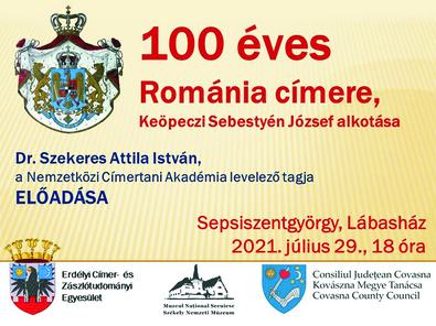 100 éves Románia címere, Keöpeczi Sebestyén József alkotása címmel tart előadást ma 18 órától dr. Szekeres Attila István heraldikus, az Erdélyi Címer- és Zászlótudományi Egyesület elnöke Sepsiszentgyörgyön a Székely Nemzeti Múzeumnak időlegesen helyet adó Lábas Házban. Az előadásra abból az alkalomból kerül sor, hogy száz évvel ezelőtt, 1921. július 29-én jelent meg Románia Hivatalos Közlönyében az első világháború után megnagyobbodott Román Királyság bővített címere.
