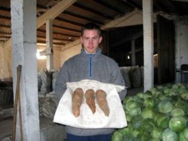 A szerencse kedvezett idén a kézdimartonfalvi Héjja Magdolna termelőnek, mázsaszám takaríthatta be hatolykai kertjéből a ritka áldást. Képünkön: Héjja Alpár három 80 deka súlyú sárgarépával.