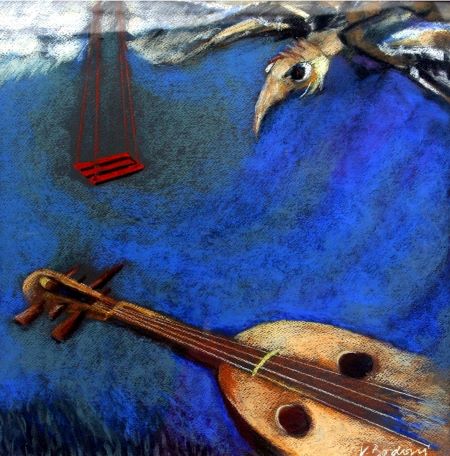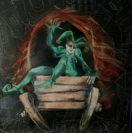 A Nagy utazás ekhós szekéren utazó bohóca megy valami ismeretlen felé, ami ellen nincs kifogása, csendes töprengő engedelmességgel lép ki ebből a világból, s fekete papíron fehér krétával kézdivásárhelyi épületek halvány sziluettjei veszik őt körül.