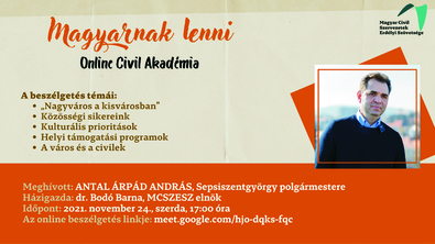 A Magyar Civil Szervezetek Erdélyi Szövetsége folytatja a Magyarnak lenni – Online civil akadémia sorozatot ma 17 órától, melynek meghívottja Antal Árpád András, Sepsiszentgyörgy polgármestere. A beszélgetés témái: „Nagyváros a kisvárosban”; Közösségi sikereink; Kulturális prioritások; Helyi támogatási programok; A város és a civilek. Házigazda: dr. Bodó Barna MCSZESZ-elnök. Az eseménnyel kapcsolatosan érdeklődni lehet a civilkv@gmail.com e-mail-címen vagy a 0787 311 117-es telefonszámon.
