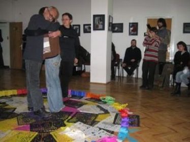 Másnap kezdődtek a Mexikó—Erdély alcímű Eruptio 6 — Régióközi Akcióművészeti Találkozó performanszai. Maréknyi csapatunk érzékeny és közönségünkre erős hatást gyakorló műveket hozott létre. Sorrendben a Monica és Victor Abrazo (Ölelés) című interaktív installakciója volt az első. Mexikóra jellemző vidám, halottak napi selyempapír színmező közepén állva felkértek önkénteseket egy-egy ölelésre, miközben társuk elmesélte valamelyik, számára fontos ölelés körülményeit. Megosztva mindnyájunkkal régi vagy közelebbi emléküket, beavatás szintjén. E sorok írója Fény alkotásával előbb önmagát, majd a közönség minden tagját kabátujjba bújtatott elemlámpákkal világította meg. Fényérintés jellegű, rövid akcióként, a közönséget időszakosan a figyelem központjába helyező szándékkal. Vetró Barnabás a már előbbi munkáiban is megtapasztalt, rejtőző típusú — a tárgy szerepét kiemelő — minimalista akciót mutatott be. A zavaró gyerekhangokra reagálva, a négyéves Ütő Elekkel folytatta figyelempróbáló akcióját, sikeresen. Költői hanglejtésű, finoman tárgyi és lelki rezgésekre reflektáló gyöngyszem volt e mű az est akciói között. A Péter Alpár nyíltan politikai színezetű, action-painting típusú, Fehér című cselekménye tömören jelezte az esemény lényegét: Erdély találkozását Mexikóval. Fehér asztalon fehér papírlapot jelenített meg, majd az előkészített piros és zöld festékes tégelyekbe mártva kezeit, vizualizálta a mexikói és a magyar zászlók azonos színezetét. Tiszta, szinte plakátszerű, erős képi struktúrát teremtve meg akciójával. Végül pedig a Plugor Sándor Művészeti Líceum végzős diákja, Szász Tünde Emlékezz rájuk címmel tizenkét rituális gyertyagyújtást eszközölt, mindannyiszor kifújva a lángot. Képismétlő akciója során meditációra alkalmas időt kínált fel önmagának és közönségének egyaránt. Az akciók változatosságukban jelezték korunk gondolatainak egy szűk szeletét, mely akár tükre is lehet Erdély és Mexikó megoldott, vagy megoldásra váró problémáinak. Elvontan, vagy közvetlen módon, a művészet nyelvezetén. Vendégeink véleménye szerint a Sepsiszentgyörgyön művelt performansz, hangköltemény, happening — egyszóval akcióművészet végtelenül kifinomult, érzékeny, de ugyanakkor olvasatában univerzális. Ütő Gusztáv