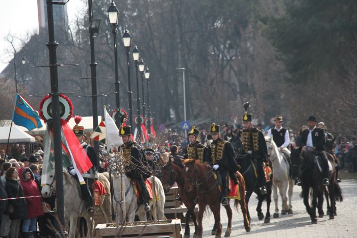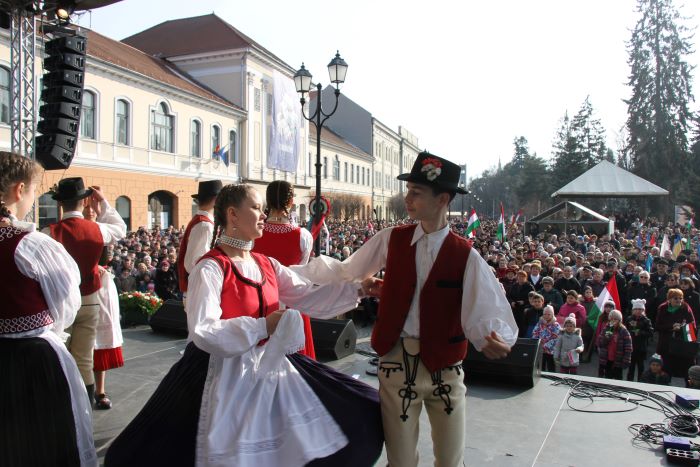 A városközpontban több ezren gyűltek össze együtt ünnepelni, kokárdás gyermekek és fiatalok, a márciusi tél kegyes napsugarait élvező idősebbek várták a magyar lovassági induló dallamára bevonuló hagyományőrző huszárokat, lovasokat, kik az 1848-49-es szabadságharcban résztvevő nemzetek zászlói felvonultató cserkészeket követve lovagoltak végig a téren.